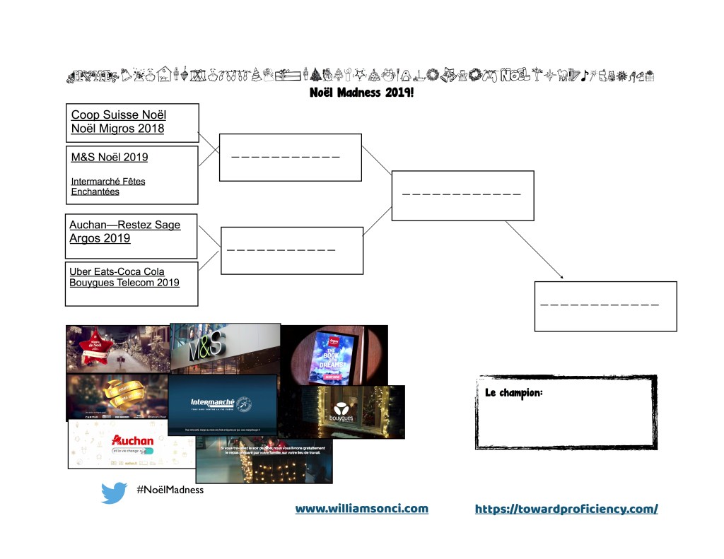 Here is the 2019 edition of the Noël Commercial Madness! This is the full version that contains 8 commercials with activities to make each commercial comprehensible such as readings, image sequence, graphic novels (comic strips), transcripts, matching, teacher notes, MovieTalks, lesson ideas, and more. There is a link to a Google Drive folder that contains all of the activities, bulletin board materials, downloaded commercials, screenshots, and the 2019 bracket. The Google doc has links to Edpuzzle, gallery walk, Take One tab running activity, screenshot slideshows, MovieTalk slideshows, lesson plans, and a few links to dig further.