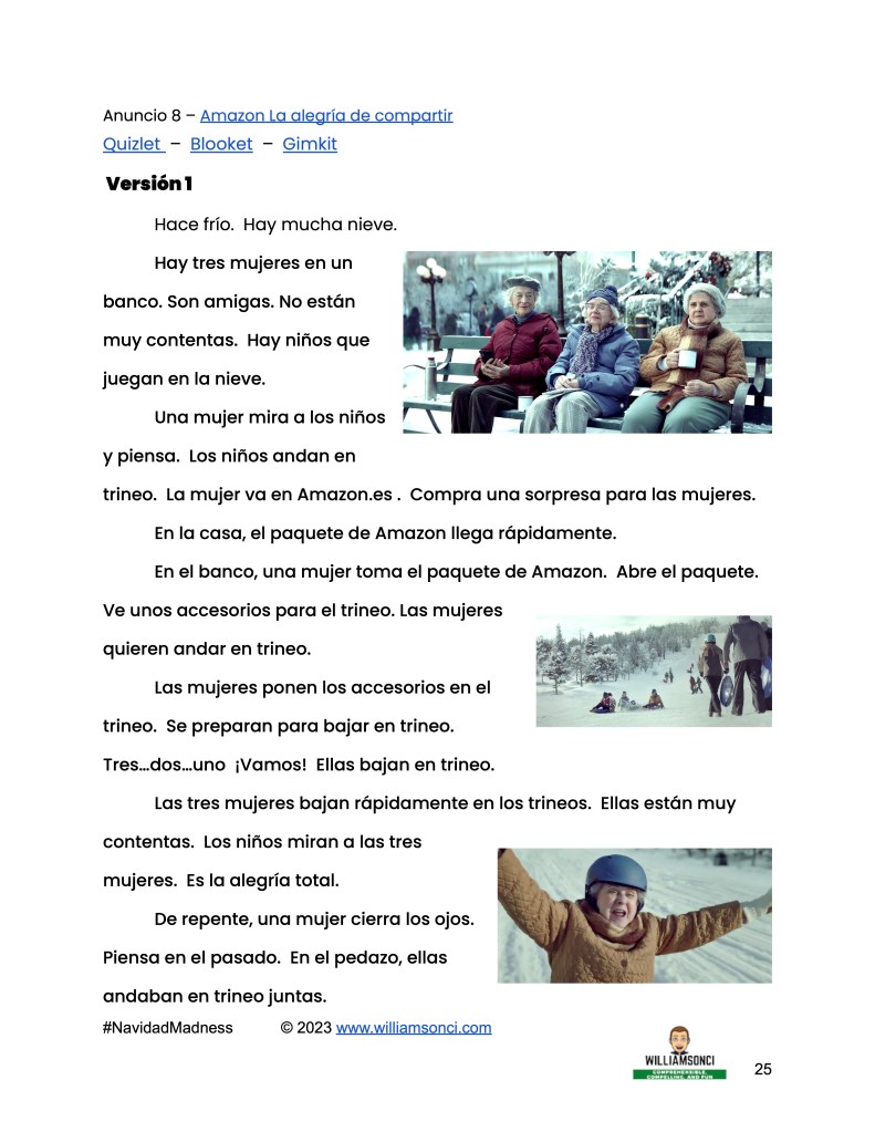 Here it is! The 2023 edition of the Navidad Commercial Madness! This edition contains 8 commercials with activities to make each commercial comprehensible such as readings, image sequence, writing activity, write, transcripts, matching, and more. It has links to Gimkit, Quizlets, Blooket, screenshots, and a full slideshow of all of the commercials with the activities. This takes as looooooong time to make so I hope you enjoy it. All of these activities are at the novice-mid to novice-high level and are good for all levels.