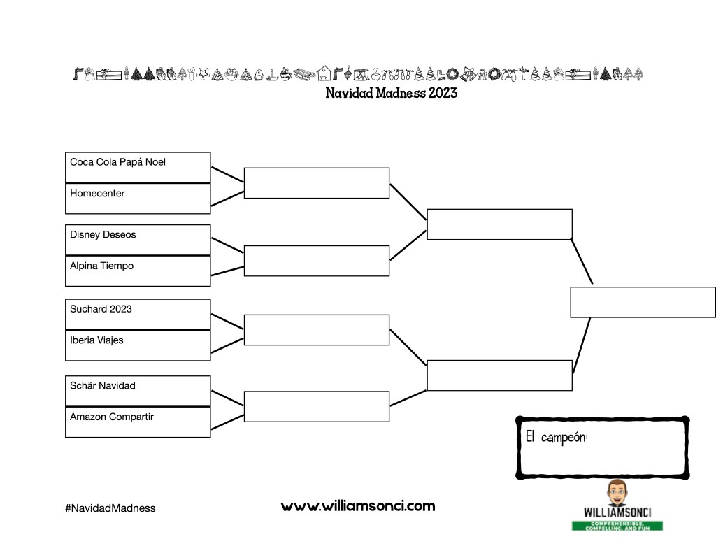 If you are doing the Navidad Commercial Madness for the first time, you can also use the 2022 edition. It contains both an 8-commercial bracket and an 16-commercial bracket. HERE IT IS.